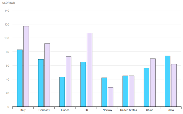 Grafen nedenfor fra IEA viser, at elektricitetspriser fra 2019 til 2024 var steget markant mere i Europa end i USA og Kina, så de nu ligger langt over (2019 i blå og 2024 i lilla).