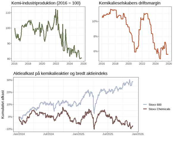 Grafen til højre viser, at sektorens (børsnoterede) selskaber har oplevet kraftige fald i driftsmarginer de seneste år. Blandt andet drevet af de to faktorer, så har kemikalieaktier underperformet et bredt indeks for europæiske aktier, hvilket ses i den nederste graf.