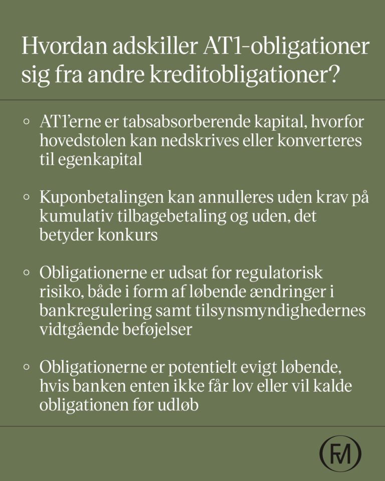 Vilkårene på AT1’en er overordnet, at investorer modtager en årlig kupon på 7,125 % frem til november 2030. På dette tidspunkt kan banken vælge at førtidsindfri obligationen til kurs 100 eller lade den fortsætte, hvorefter kuponen justeres i forhold til det gældende risikofri renteniveau. Den ultimative risiko ved en AT1-obligation er, at tilsynsmyndighederne i en alvorlig krisesituation kan nedskrive obligationens værdi til nul, hvilket er sket få gange det seneste årti og senest i forbindelse med Credit Suisse.