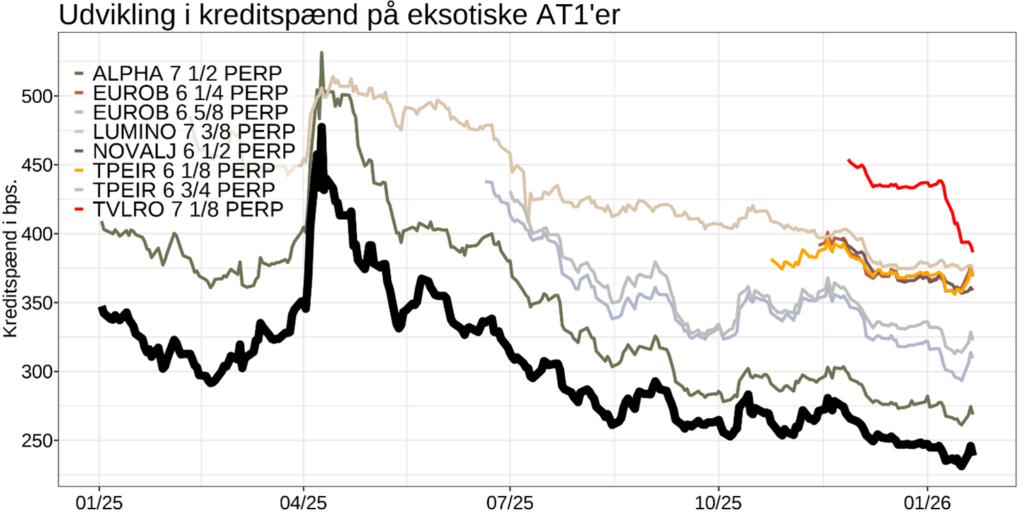 I Marselis’ kreditfonde har AT1-obligationer fra banker fyldt en betydelig del af porteføljerne siden fondenes lancering. Vi følger derfor løbende markedet for at vurdere, om enkelte AT1’er fremstår attraktive. Vores vurdering er, at man bør være varsom med eksponering mod AT1-obligationer som TVLRO 7 1/8 PERP, medmindre man modtager en betydelig risikokompensation – hvilket ikke er tilfældet i dag.